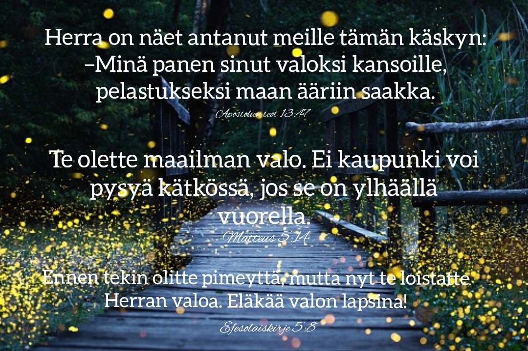 Oi jos minä olisin tuo pieni valo, joka meni tuon suuren valon luo, niin en mitään muuta kaipaisikaan. Itse oivalsin, että ei mitään väliä, mikä kohtaloni on, kunhan olen Jeesuksen kyydissä.