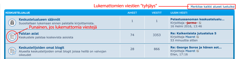 Jos tästä on apua, niin ne viimeisimmät viestit muuten tunnistaa aina siitä, että alueen "pallura" siinä nimen vasemmalla puolella on punainen eli silloin siinä alueessa on lukemattomia viestejä. Mulla meni aika pitkään ennen kuin tajusin, että siitä on hyötyä. Jos haluaa aloittaa ns. puhtaalta pöydältä, niin voi klikata keskustelualueen yläreunassa oikealla "Merkitse kaikki alueet luetuiksi" ja sitten alkaa seurata uusien viestien ilmestymistä.
