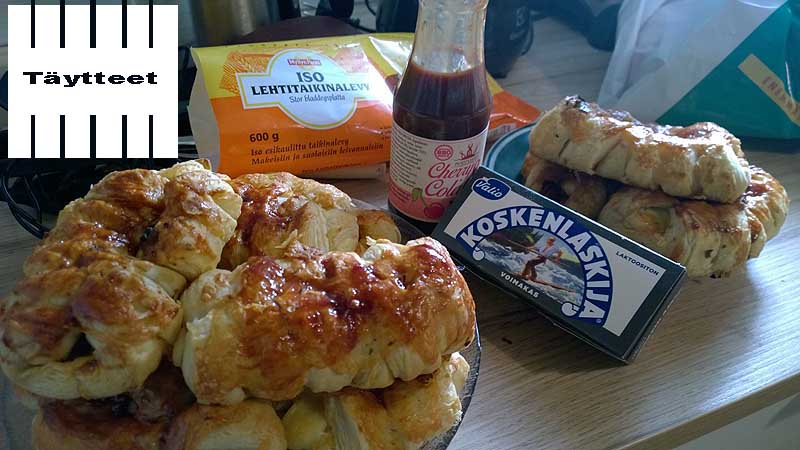 Taikina kaulitaan ja leikataan kuvan mukaiseksi ja pannaan täytteet, pekoni ja Koskenlaskija juustoviipale päälle.