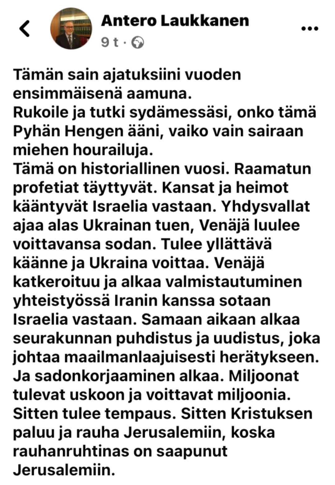 Eihän sitä voi kuin ihmetellä miten on ihmiskunnalla suomut silmillä, vaikka Sanassa on nämä kerrottu ajat sitten.