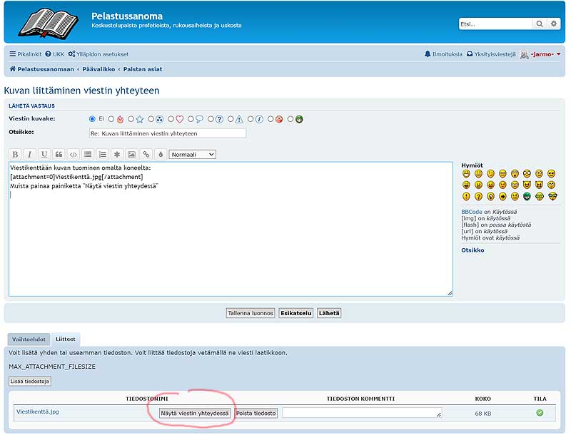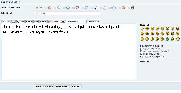 Näin kopioiotu rivi ilmestyy kenttään (kuva alla) Sitten maalaat rivin jonka olet kopioinut, pitämällä hiiren vasenta näppäintä pohjassa ja liikutat sitä koko sen kopiodun tektirivin yli. (Kuva) Tämän jälkeen paina kuvassa punaisella näkuvää IMG nappia, jolloin rivin päihin ilemstyi muutama koodi lisää Lopuksi paina "Lähetä" painiketta