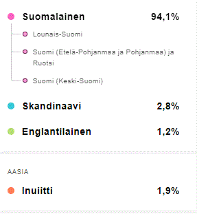 Noita "kaikuja", " jämiä" on kaikilla testaajilla, vaikka siis ei ole mitään geneettistä sukulaisuussuhdetta noihin kaukaisiin etnisiin ihmisryhmiin. Sillä Aadamin, ja Nooan, jälkeläisinä kaikilla testaajilla on aina pieni prosentti "sitä sun tätä". Umpisuomalaiset juuret sinulla.