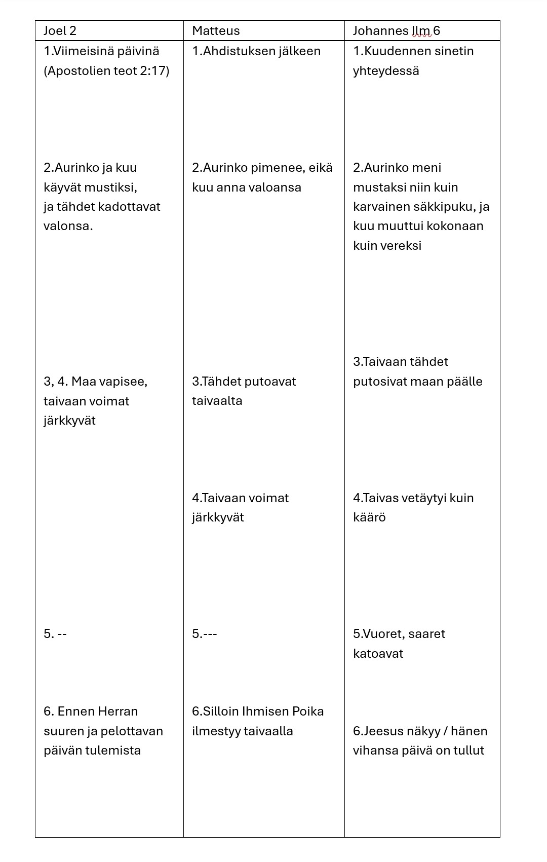 Eero kirjoitti: ↑16 Tammi 2026, 00:14 Joo, aurinko ja kuu eivät pimene yhtäaikaa normaaliolosuhteissa ja tätä mä oon siis jo aikaisemmin tutkinut, että auringon ja kuun pimeneninen tarkoittavat Raamatussa hyvin todennäköisesti aina yhtä ja samaa tapahtumaa, joka tapahtuu ennen Herran (Vihan) Päivää Israelin ollessa hyökkäyksen kohteena. Tuo tutkielma löytyy palstalla tästä samasta osiosta.