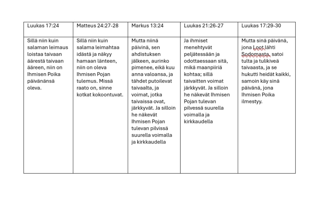 Joo, no ei tuo mun esittämä tapahtumien järjestys kyllä mitenkään vesitä noiden Tessalonikaiaiskirjeen ja Luukkaan Evankeliumin kohtia, koska Tessalonikalaiskirjeessahän puhutaan Tempauksesta ja mä yritän siis esittää auringon ja kuun pimenemistä merkkinä, joka asettaa tapahtumat oikeaan tai ainakin ristiriidattomaan järjestykseen. Tempaus Koetuksen hetkestä (Ilm. 3:10) tulee joka tapauksessa yllätyksenä ainakin niille, jotka eivät sitä odota, meidäthän siis noiden Paavalin kuvausten mukaan Temmataan Herraa vastaan yläilmoihin.