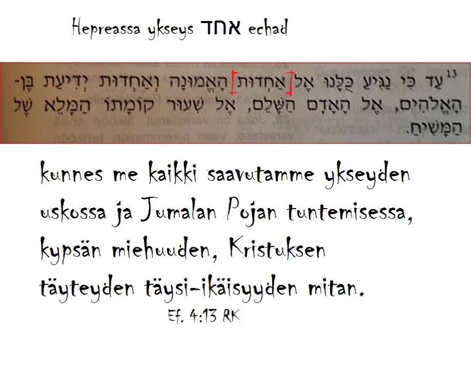 Siinä lukee; ”kunnes me kaikki pääsemme yhteyteen uskoon…..” Siinä löytyy heprean sana ’echad’, se tarkoittaa yksi, ykseys. Raamattu kansalle -käännöksen mukaan siinä kohdassa lukee; ”kunnes me kaikki saavutamme ykseyden uskossa….”Ef. 4:13 kunnes me kaikki pääsemme yhteyteen uskossa ja Jumalan Pojan tuntemisessa, täyteen miehuuteen, Kristuksen täyteyden täyden iän määrään, 33/38