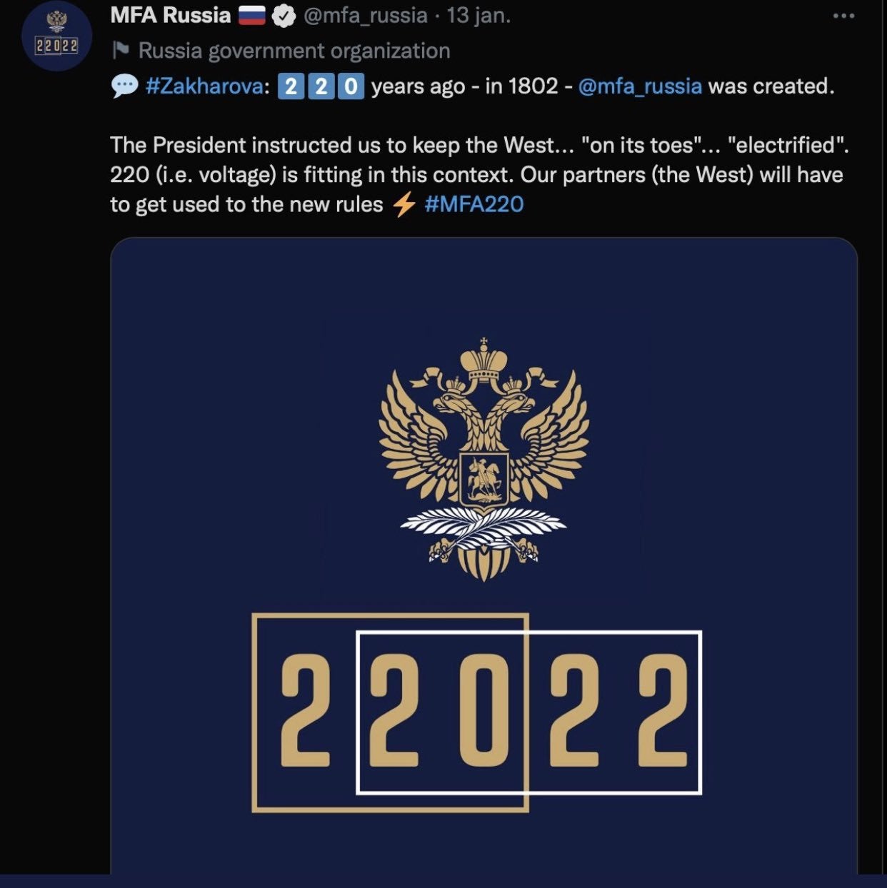 No se on tulkittu päivämääräksi 22.2.2022 eli päivä jolloin Venäjän joukot menivät Itä-Ukrainaan, virallinen selitys on kaiketi jotakin liittyen 220 volttiin eli sähköverkon jännitemäärään [LISÄYS: ja Venäjän ulkoasiainministeriön ikään, 220 vuotta].