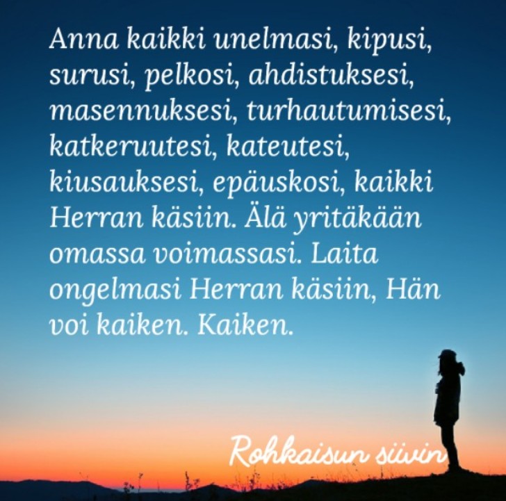Rukoilen puolestasi. Kaikki valheen voima murtukoon. Kaikki kirouksen sanat jotka sinua vastaan on puhuttu, väistyköön. Vihollinen on tullut varastamaan, tappamaan ja tuhoamaan, mutta Jeesus tuli antamaan sulle elämän ja vapauden. Rukoilen että se vapaus tulee täydellisesti osaksesi! Uskossa eläminen on vapautta pimeydestä ja ahdistuksesta. Älä kuuntele muita ääniä, ne haluaa vaan tuhota sinut. Jumala auttaa kun huudat Häntä apuun.