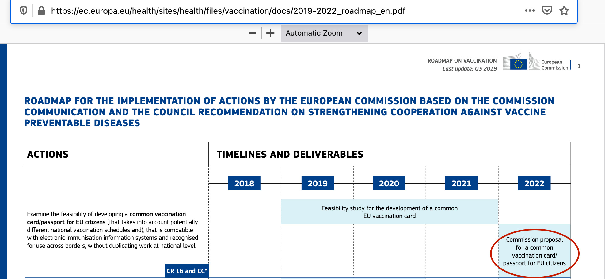 En halua laittaa suoraa linkkiä, mutta kävin tutkimassa että tuo EU-komission Roadmap on Vaccination -ohjelma on todella olemassa ja vuoden 2022 kohdalla siellä sanotaan yksinkertaisesti, että "komission ehdotus yleisestä rokotekortista/passista EU-kansalaisille: