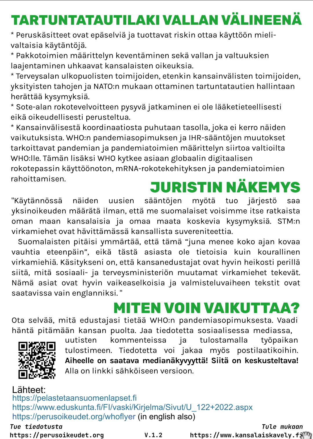 Allekirjoita adressi Suomen päätösvallan luovuttamisen estämiseksi Maailman terveysjärjestö WHO:lle ja kannata kansalaisaloitetta kansalaisten perusoikeuksien ja itsemääräämisoikeuden suojelemiseksi.
