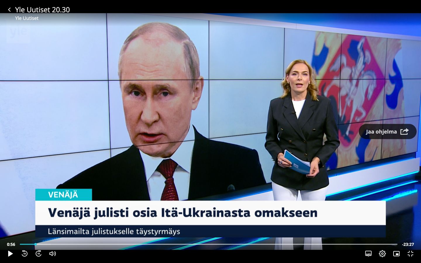 Putin siis ilmoitti näistä alueliitoksista tänään tv-puheessa, huomattavaa oli mun mielestä, että Yle ilmoitti ettei se televisioi puhetta sen "propagandistisen" luonteen vuoksi, mutta referoivat kuitenkin sen sisällön tekstiksi. Tämä herättää kysymyksiä, mutta ainakin se varmistaa sen, että vain haluttu informaatio päästetään läpi, eikä äänenpainot tai muut inhimilliset eleet välity. Samaan aikaan kuitenkin esimerkiksi USAn presidentin Joe Bidenin varsin karskit ja sotaa lietsovat puheet näytetään pääuutislähetyksiä myöten. Huomasin samalla muuten, että venäläisiä uutiskanavia on sensuroitu EU-alueella, esim. RT eli Russia Today ja Sputnik. Niiden nettisivut on siis estetty EU:n sisällä niiden levittämän propagandan vuoksi, mitä ne varmista ovatkin, mutta uskon etteivät meidän paikalliset iltapäivälehtemme paljon kalpene niiden rinnalla.