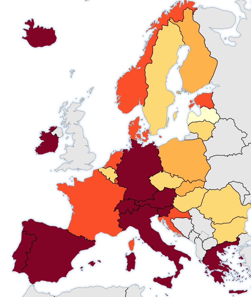 Päätin käydä vähän selvittämässä, että onko rokottamisen ja ylikuolleisuuden välillä mitään yhtäläisyysmerkkejä ja aika helposti löytyi kaksi karttaa, arvatkaas kumpi edustaa ylikuolleisuutta heinäkuussa 2022 ja kumpi yleistä koronarokotekattavuutta EU-alueella?