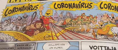 Merkillinen yhteensattuma, tarkoitan tämän Asterix-lehden tarinaa (jossa ajetaan läpi Italian Koronaviruksen ollessa mustan hevosen ohjaimissa, vieläpä naamion takana) verrattuna koronavirukseen, joka jyllää nyt voimalla koko Italian alueella.