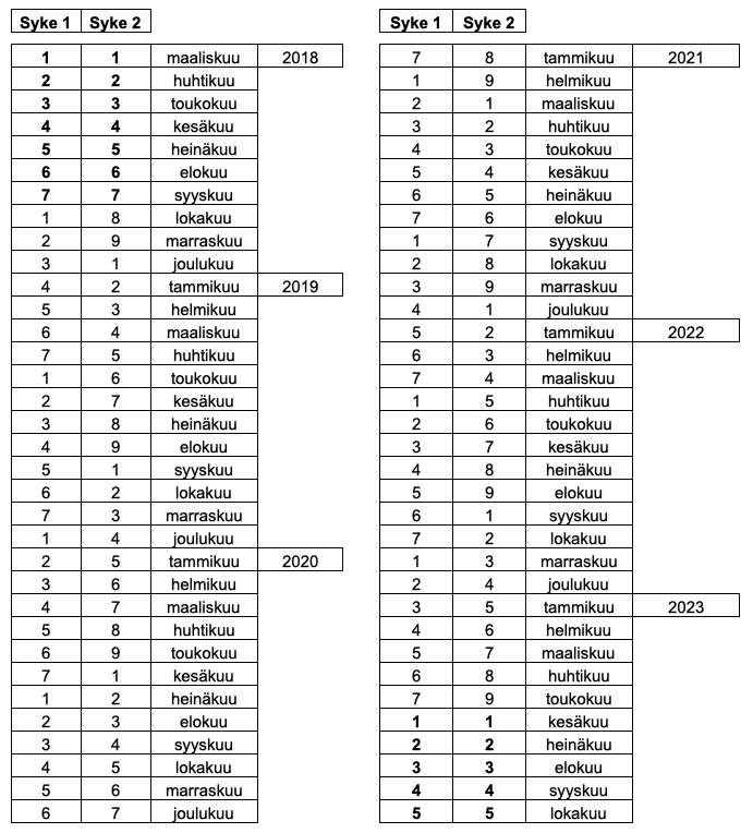 Koitin tehdä siitä tällaisen taulukon, eli tuossa näkee 7 ja 9 tahdin sykkeiden kiertokulun. Kesäkuussa 2023 ne kohtaavat ja alkaa alusta tämä kaavio. Jos tästä saa paremmin kiinni ajatuksesta.