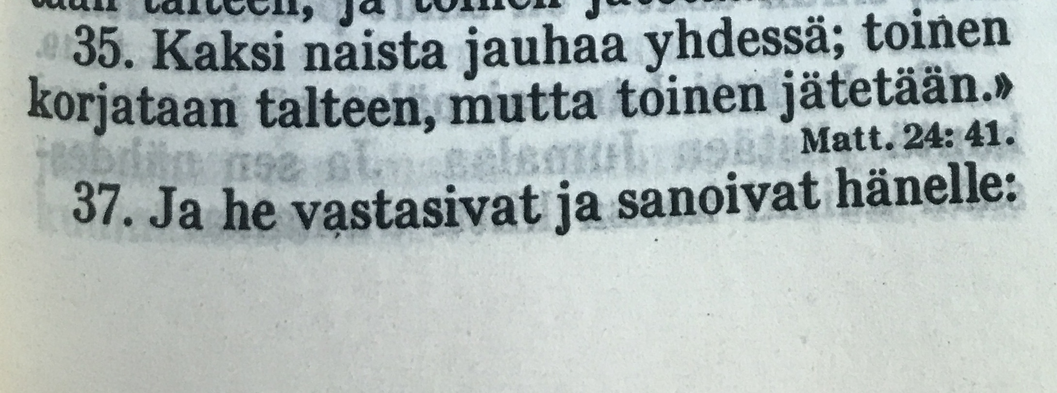 Kuuntelin hiljattain Mauno Mattilan uuden videon nimeltä 'Väärennetyt Raamatut', ja siinä hän tuo selkeästi esille sen, miten paljon näissä viimeisimmissä käännöksissä on suorastaan vääristelty alkuperäistä Pyhää Sanaa ! Oli kyllä mielenkiintoinen esitys.