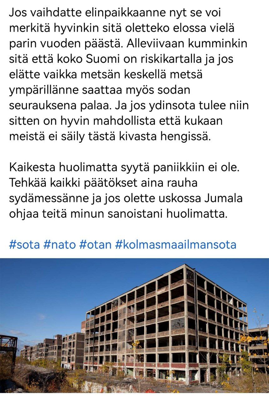 Mutta joo, profetoiminen on myös vajavaista ja ehkä tässä voi nähdä että, profetoijan oma ajatus vuotaa läpi. Sen sijaan jos Suomen kansa ylpistyy ajattelemaan että turva tosiaan on ihmisissä tai aseissa, niin siitä Herra antaa varmasti palautteen ja tästä monet profetiat kertovatkin.