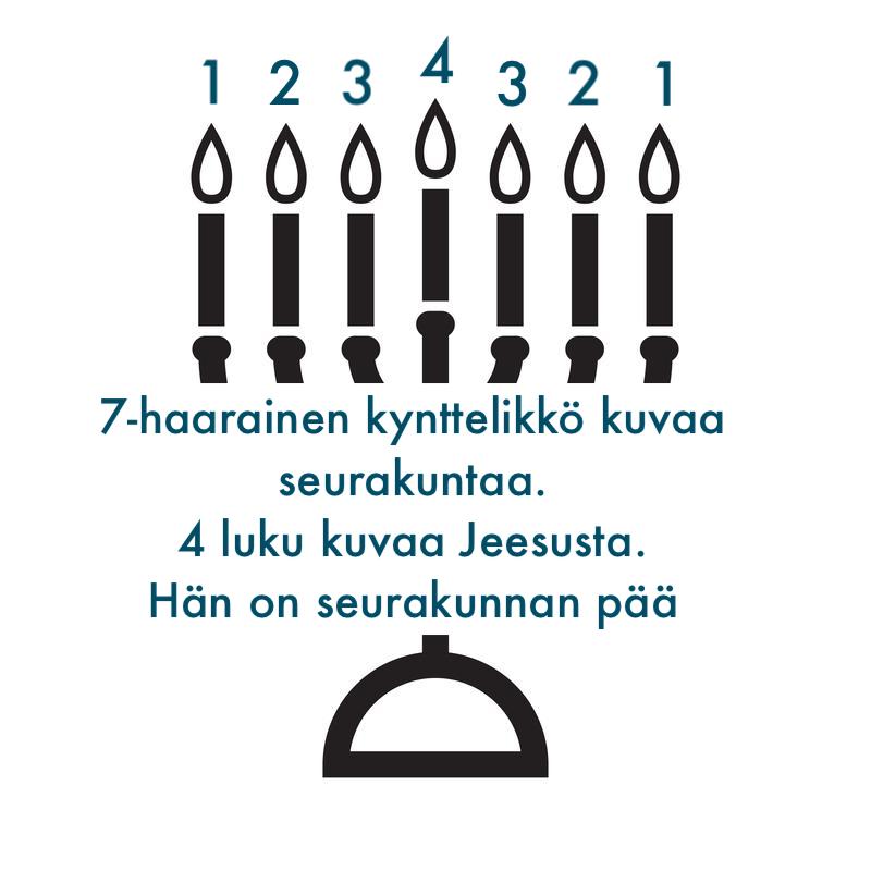 Seitsenhaaraisen kynttelikön mukaan vasemmalta oikealle lasketaan näin: 1 - 2 - 3 - - 4 ja sen kynttelikön mukaan lasketaan oikealta vasemmalle näin: 4 - - 3 - 2 - 1. Sen kynttelikön keskemmältä on 4, se kuvaa Jeesusta. Se kuvaa seurakuntaa.