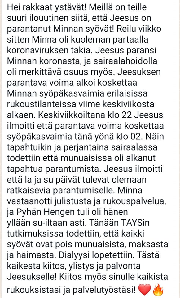 Kirkasta Pyhä Ylilääkäri myös täällä Suomessa ja sairastavien ihmisten kohdalla.
