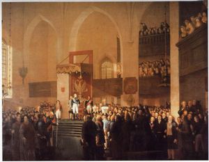 Aleksanteri I avaa maapäivät Porvoon tuomiokirkossa Aleksanteri I:n Porvoossa käyttämä valtaistuin kuuluu Suomen kansallismuseon kokoelmiin. Istuimen teetti vuonna 1797 keisari Paavali I. Valtaistuin on valmistettu lehmuksesta. Kuvassa oikealla Aleksanteri I:stä esittävä maalaus.