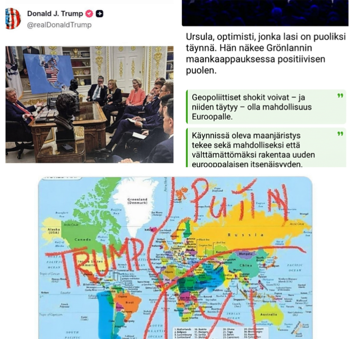 Ps. Stubbikin istuu Trumpin pakeilla kuvan huoneessa jossa on esitetty Suur-Amerikka Grönlanteineen... Maailman kolmijako jonkun piirtämänä ja Ursula von Leyenin näkökulma...🤔