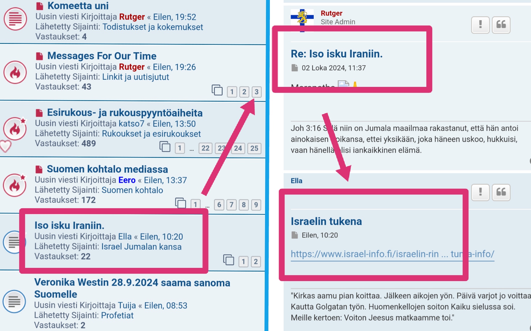 Elikkä kuvana vielä... On siis iso isku Iraniin ketjussa...tosin näyttää siltä että Ella on vastannut ko. ketjussa Re:Iso isku Iraniin-vastauksen sijaan "Israelin tukena-otsakkeella" - siksi "se" ei tiemmä näy tai ei löydy...🕵️