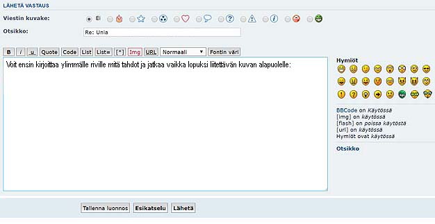Näin kopioiotu rivi ilmestyy kenttään (kuva alla) Sitten maalaat rivin jonka olet kopioinut, pitämällä hiiren vasenta näppäintä pohjassa ja liikutat sitä koko sen kopiodun tektirivin yli. (Kuva) Tämän jälkeen paina kuvassa punaisella näkuvää IMG nappia, jolloin rivin päihin ilemstyi muutama koodi lisää Lopuksi paina "Lähetä" painiketta