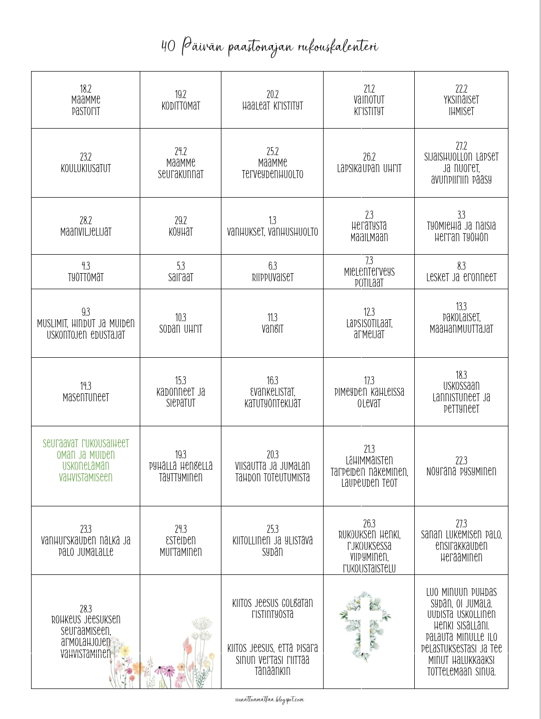 Omalla laskupäällä tänään 40 päivää pääsiäiseen. En löytänyt sopivaa paasto/rukouskalenteria kotimaiset keskittyy ympäristöön ja ulkomaiset on joko maksullisia tai keskittyy ainoastaan omaan hengelliseen elämään joten askartelin oman 😏