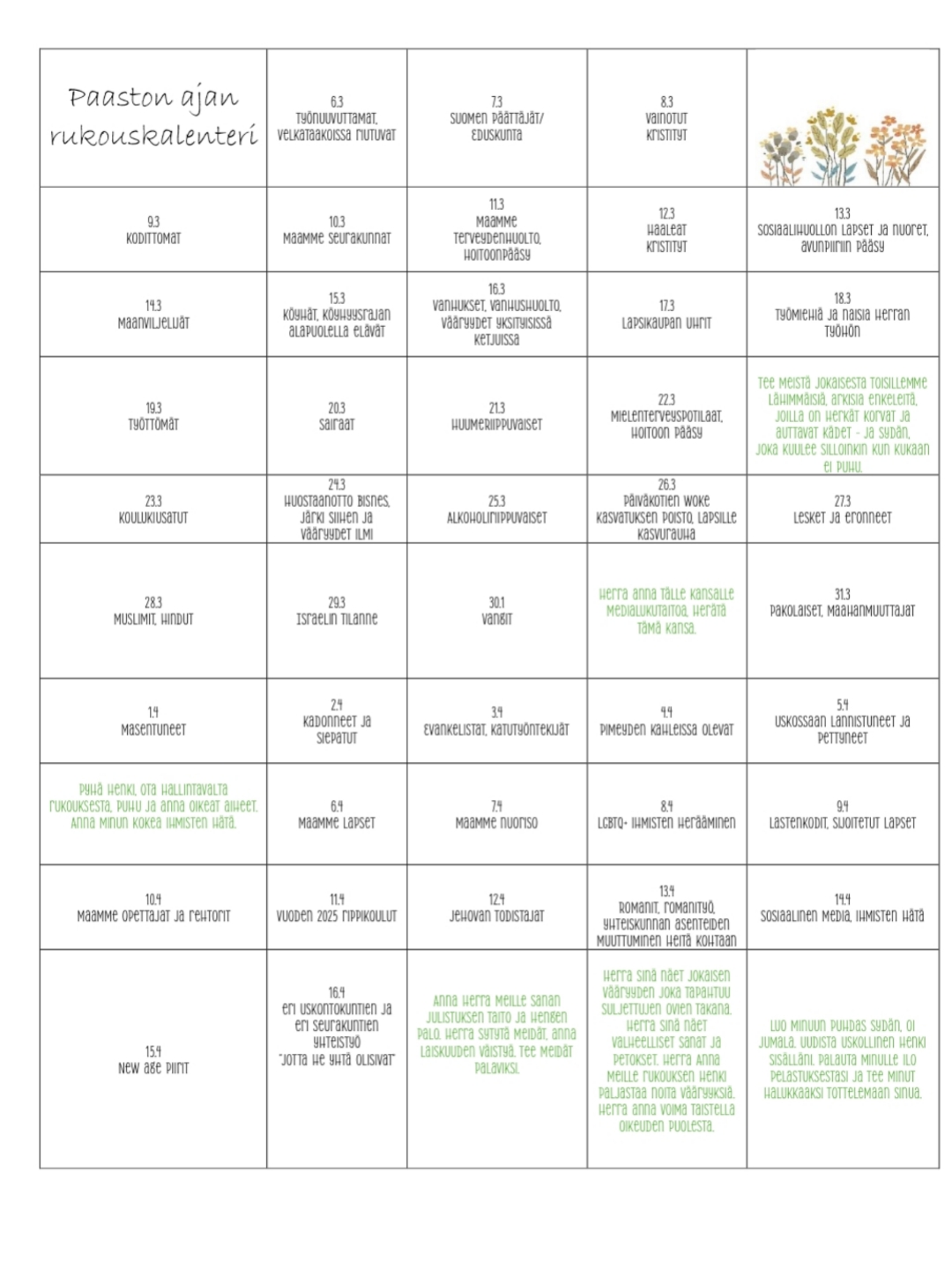 Rukousaiheet eivät ole tärkeysjärjestyksessä, ja jos joku ryhmä on unohtunut kalenterista, se ei tarkoita että olisi yhtään vähemmän tärkeä. Rukoillessa harvoin muistaa kaikkia apua tarvitsevia joten kalenteri pohjaksi ja kannustukseksi rukoukseen. Aihealueista saa ja pitää rönsyillä rukoillessaan, Pyhä Henki johtakoon meitä rukoukseen, eikä unohdeta kysyä Häneltä rukousaiheita 🙏💎