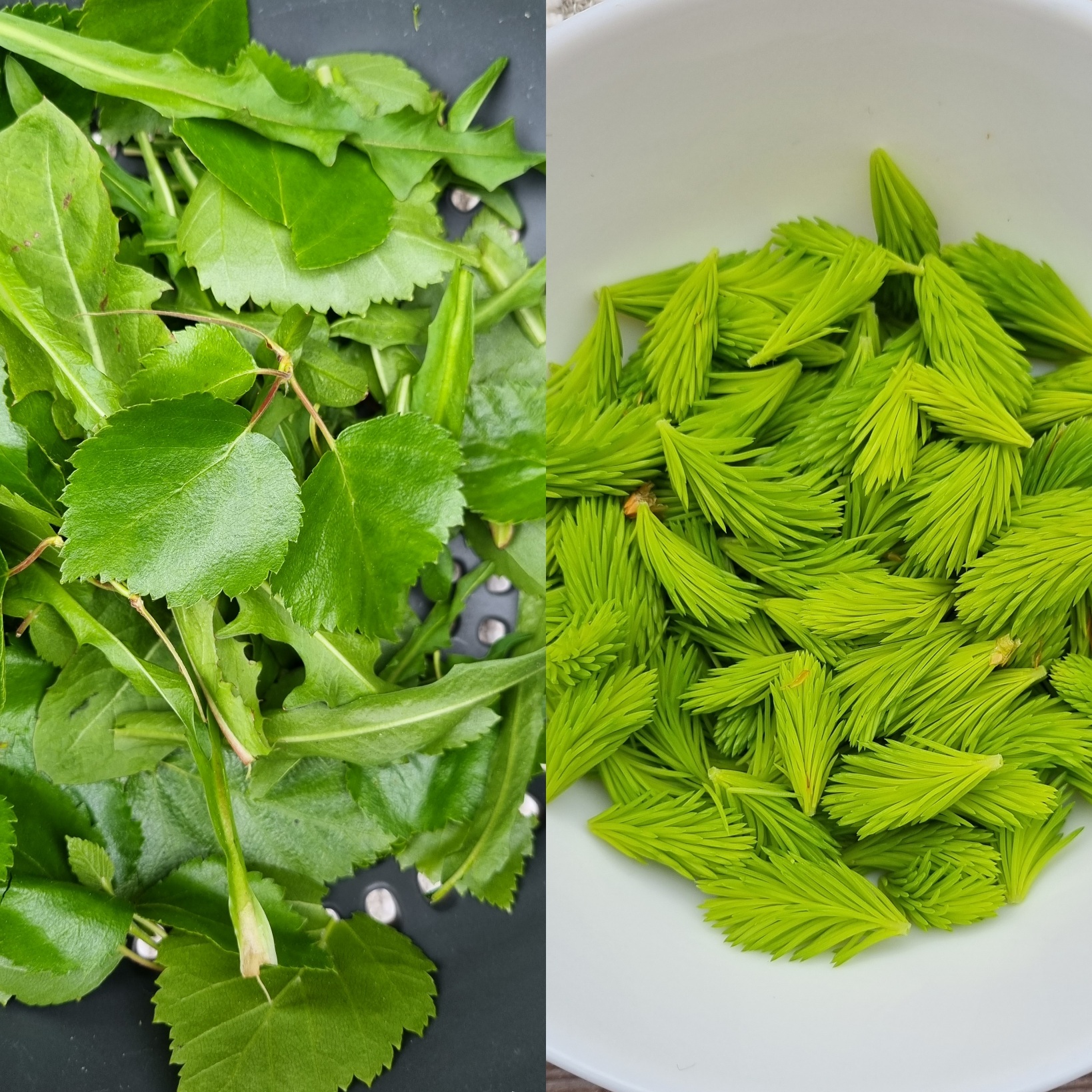 Nuutuneelle mielelle kerätty luonnon ilmaista C-vitamiinia. Salaattiin voikukan- ja koivunlehtiä ja "irttareiksi" kuusenkerkkää. Jumalan luoma luonto on ihmeellinen