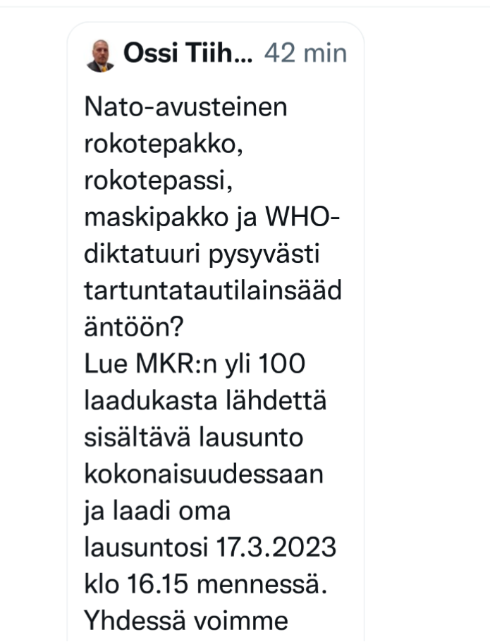 https://pelastetaansuomenlapset.fi/hape ... ustoltaan/Esim. lakiin jo aiemmin lisätyt määräykset pakollisista rokotuksista ja lääketieteellisistä toimenpiteistä, joita "perusteltiin" sillä, etteivät ne ole Nurnbergin säännösten sanamuodon mukaisesti "lääketieteellisiä kokeita", vaan kliinistä toimintaa. Viitataan siis kintaalla itsemääräämisoikeuden ja koskemattomuuden periaatteille muotoseikkojen kautta.