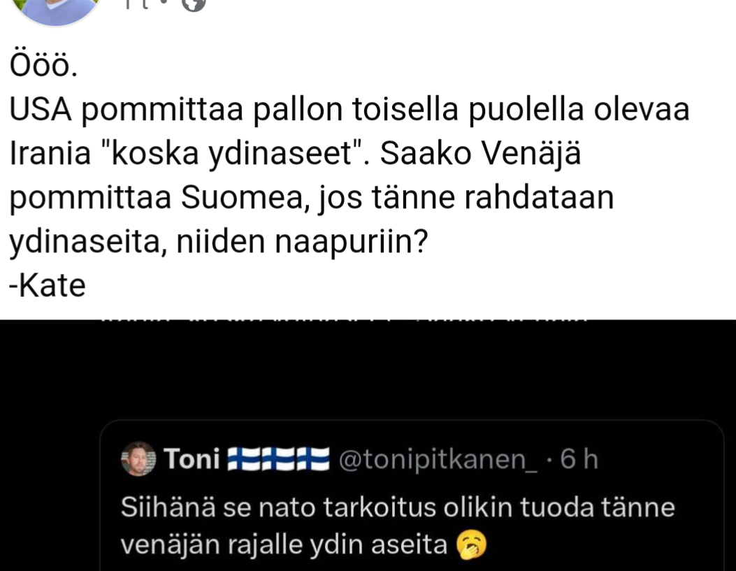 Joo, mietin vaan, että jättäytyikö Suomi pois, ainakin toistaiseksi, Ranskan ydinasepelotteesta, koska meillä lainsäädäntö estää ydinaseet maan alueella kaikissa muodoissaan, mutta Ruotsissa "vastaava keskustelu" on jo käyty.