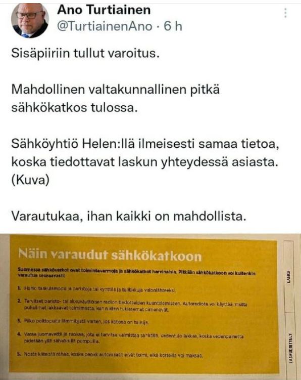 Uskon Jeesukseen kirjoitti: 04 Tammi 2022, 12:12 Elikkä sähkökatko voipi siis johtua Olkiluoto 3 ydinvoimalan käynnistyksestä. Ilmeisesti tuo keltainen varautumisohje on Helen:in sivuilta.
