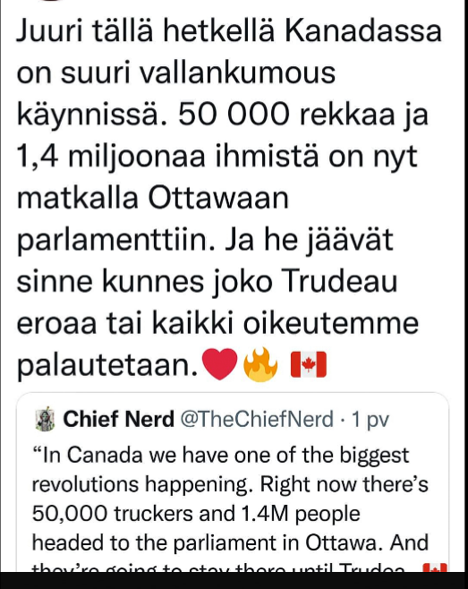 "Kanadalaiset ovat saaneet rajoituksista tarpeekseen ja ovat aikeissa rekoilla- ja muilla ajoneuvoilla ruuhkauttaa koko pääkaupunki Ottawan moneksi päiväksi. Vaikutus tulee ulottumaan monin tavoin myös pääkaupungin ulkopuolelle. Ja jopa Yhdysvaltain ja Kanadan rajalle, sillä yhdysvaltalaisia tulee tukemaan tätä kanadalaisten massiivista mielenilmausta.