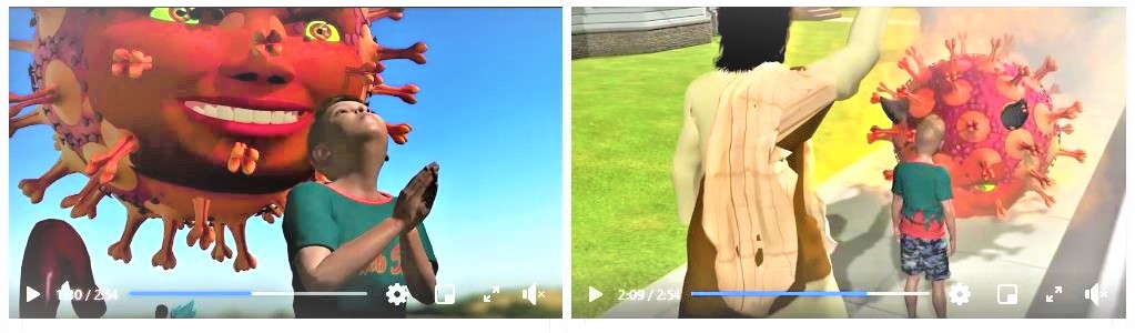 Animaatio jossa Jeesus tuhoaa koronaviruksen. Alussa kaikki kumartavat koronaa, mutta lopussa oleva lapsi kääntyy. polvistuu ja rukoilee Jeesusta ja Jeesus tulee ja tuhoaa koronan,