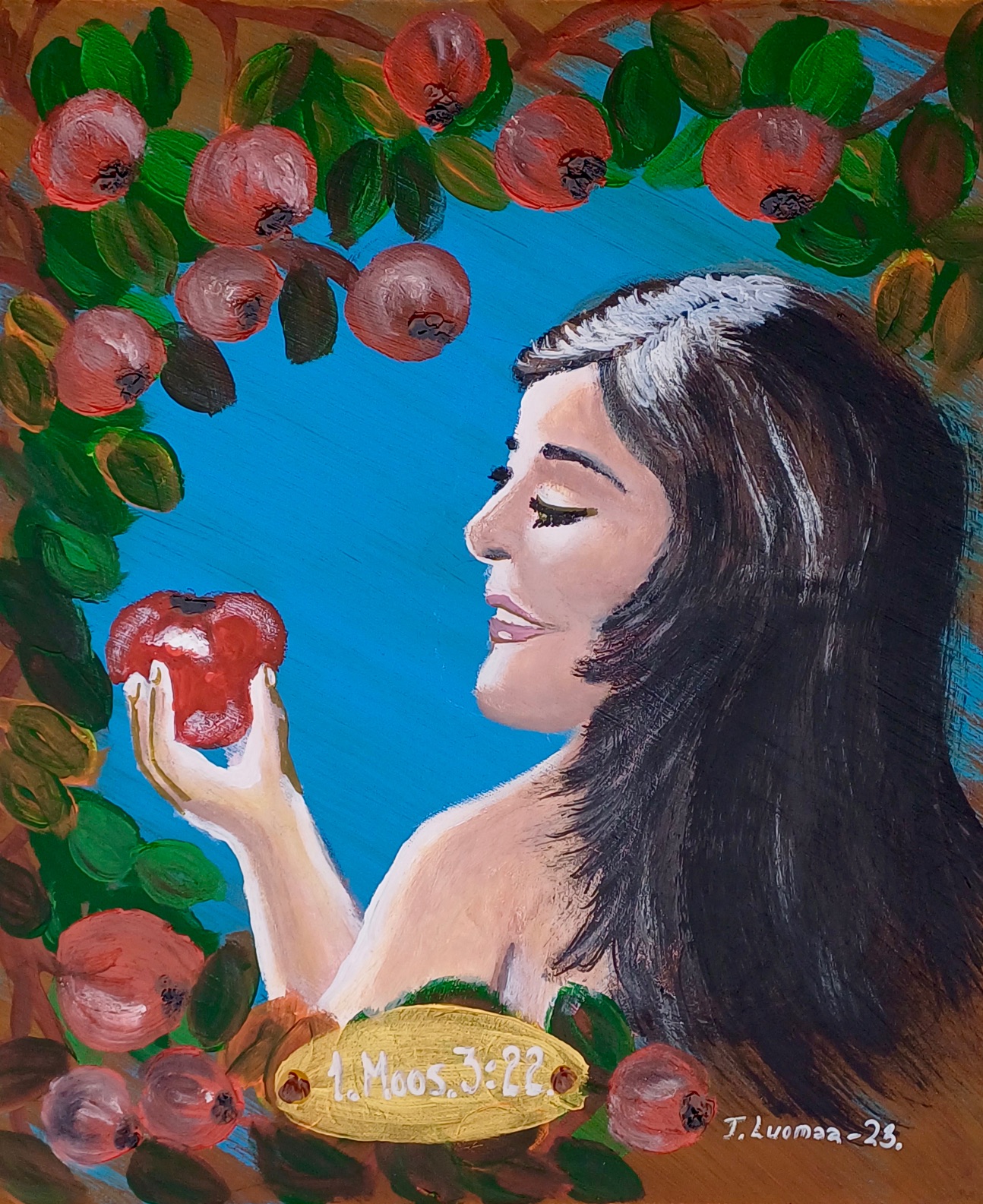 Mun mielestä tämä kuva kertoo kaiken siitä miten helposti me ihmiset olemme vieteltävissä, jopa syntiin josta kärsisimme heti kuolemanrangaistuksen Herran edessä, ellei olisi Jeesusta. Tätä Armon määrää ei voi kukaan käsittää, mutta Herra on silti sen meille omalla ruumillaan lahjoittanut.1Moos. 3:22 Ja Herra Jumala sanoi: "Katso, ihminen on tullut sellaiseksi kuin joku meistä, niin että hän tietää hyvän ja pahan. Kun ei hän nyt vain ojentaisi kättänsä ja ottaisi myös elämän puusta ja söisi ja eläisi iankaikkisesti!