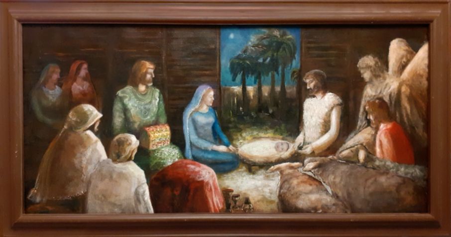 Se on tehty yli kymmenen vuotta sitten ja teoksen koko on 92 x 47 cm. En tiedä voisiko tätä sanoa jopa romanttiseksi tai realistiseksi tyyliksi, sillä mulle tulee tästä mieleen jotkin Pekka Halosen teokset. Hieno teos joka tapauksessa ja ajankohtainen aihe näin Herramme Syntymäjuhlan alla.
