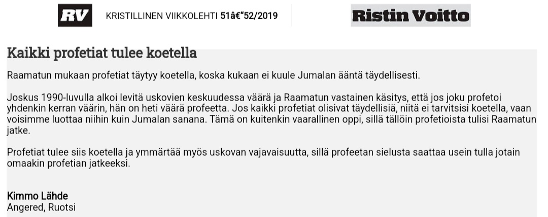 Ei kannata antaa katteettoman pitää meitä talutusnuorassa vaan koetelkaamme aina kaikki kaikella ymmärryksellä että kyse on vajavaisuudesta.1Tess. 5:21 mutta koetelkaa kaikki, pitäkää se, mikä hyvää on;