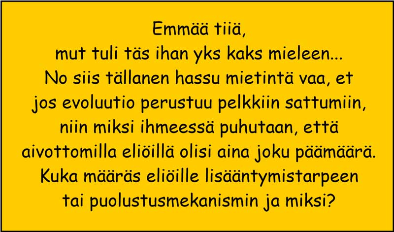Mutta ajatelkaas kun mä joskus 2009 kun opiskelin poliisikoululla Tampereella ja kävin aina keskiviikkoisin pikkuserkkuni tykönä sanunomassa ja hän on tieteen harrastaja/tutkija/lääkäri ja työskentelee kirurgina TAYS:ssa. Hän on tosiuskova Adventisti ja erittäin kiinnostunut juurikin kreationismin todistamisesta.