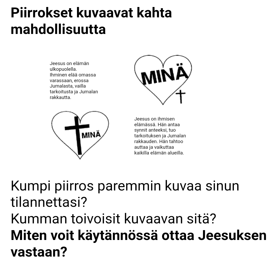 "Tarvitsen sinua, Jeesus. Tunnustan, että olen tehnyt syntiä sinua vastaan. Kiitos, että olet kuollut ristillä ja kärsinyt syntieni rangaistuksen puolestani. Avaan tällä hetkellä elämäni oven sinulle ja vastaanotan sinut Herrakseni ja Vapahtajakseni.