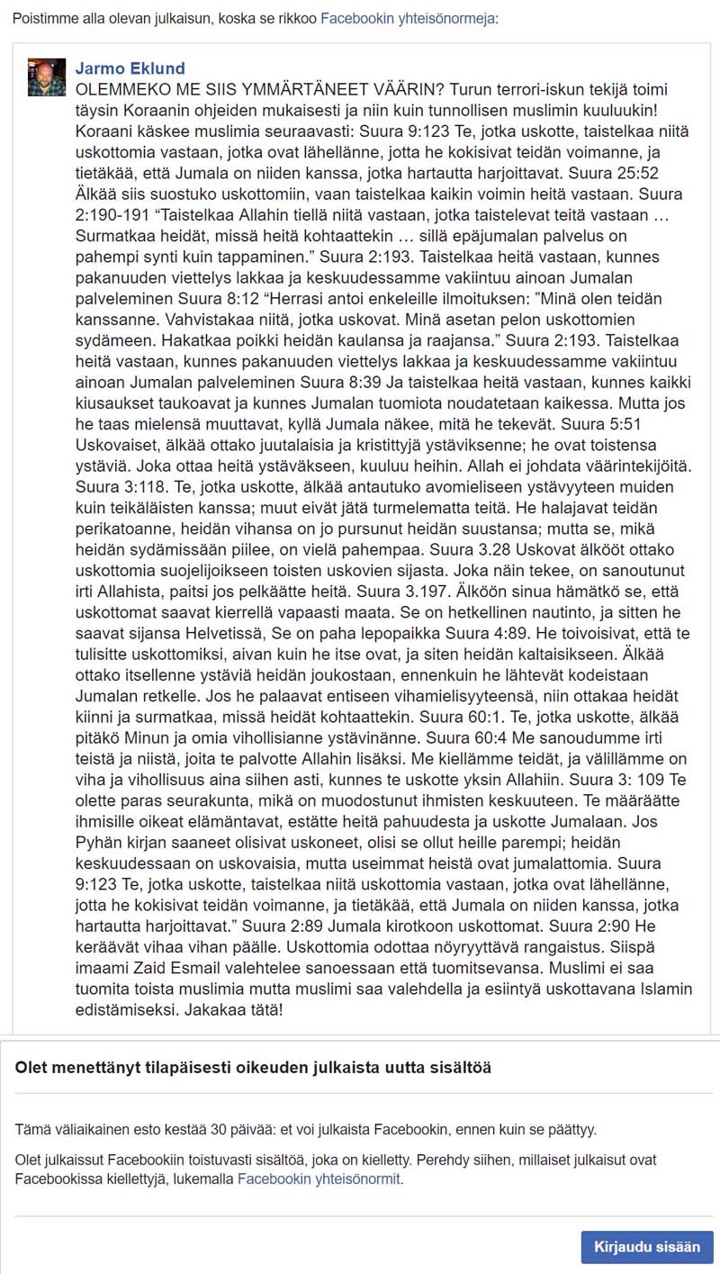 Ai niin... sellainen lupaus moderaation puolesta vielä, että vastaavien jakeiden julkaiseminen Pelastussanomissa ei johda banneihin-jarmo- kirjoitti:Huikeeta! Sain bannit facebookissa koska julkaisin Koraanissa olevat lauseet jae jakeelta jotka kiihottavat terroritekoihin muslimeita.