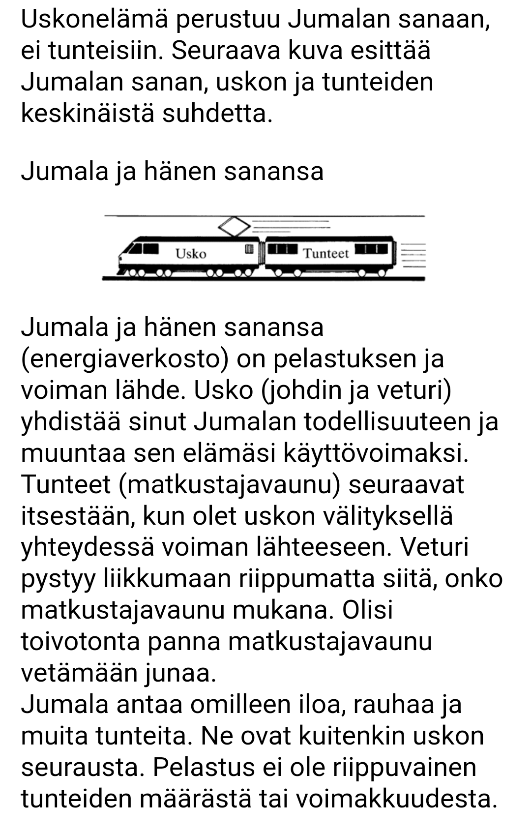 Jumala ja hänen sanansa (energiaverkosto) on pelastuksen ja voiman lähde. Usko (johdin ja veturi) yhdistää sinut Jumalan todellisuuteen ja muuntaa sen elämäsi käyttövoimaksi. Tunteet (matkustajavaunu) seuraavat itsestään, kun olet uskon välityksellä yhteydessä voiman lähteeseen.