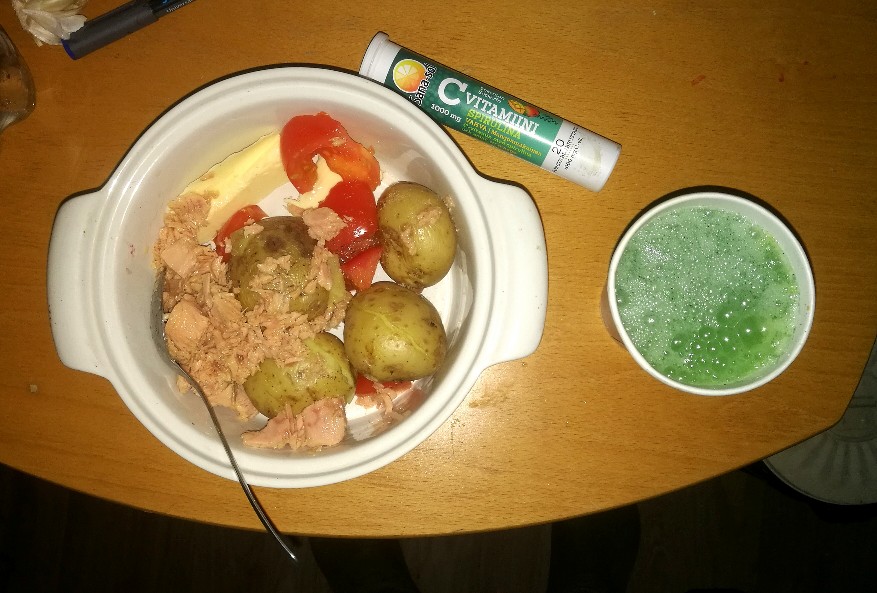 Kylmiä perunoita, tomaattia, Abba-tonnikalaa, voita ja Himalajan ruususuolaa...